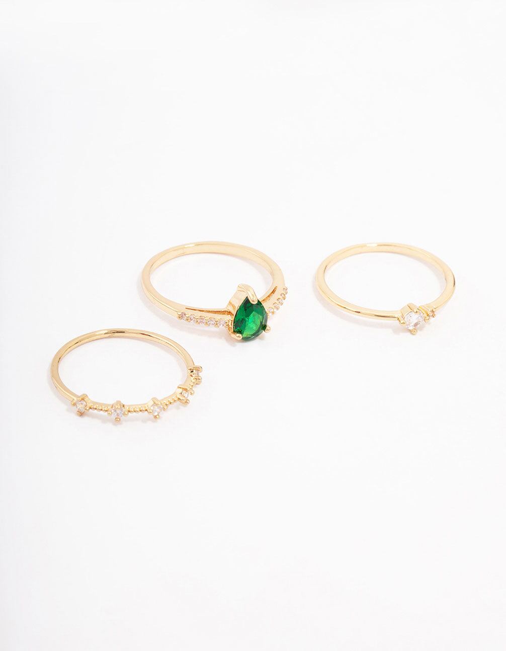 For a detailed addition to your stack. style these gold plated rings. This ring pack includes three individual rings. each designed with a dainty silhouette and encrusted with cubic zirconia crystals for a touch of sparkle.