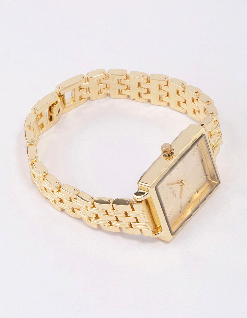 This gold watch features a vintage-inspired rectangular face and woven strap for a refined look. Pair this watch with matching gold bracelets for a personalised touch.