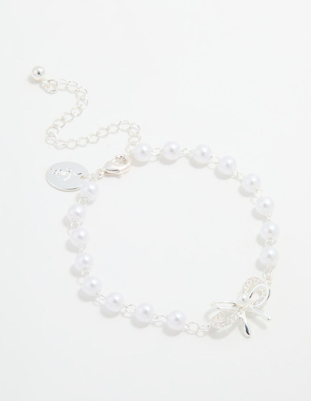 Complete your bridal look with this Silver Plated Pearl Double Bow Bracelet! This elegant piece features a chic double bow design and pearls. Perfect for adding effortless sophistication to any outfit.
