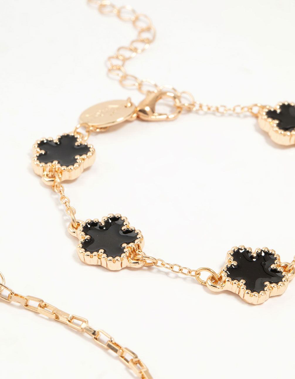 Add some sparkle to your wrist game! This gold-toned bracelet set includes a chic black flower designed bracelet and two stylish chain bracelets. Wear them together for a lucky vibe or solo for a sleek look.