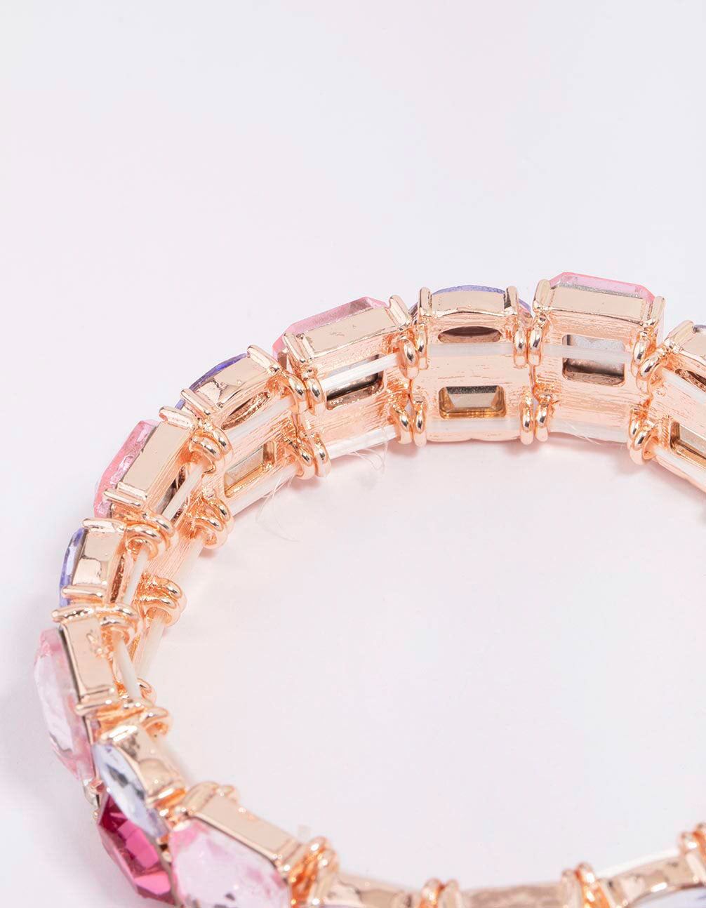 Add a pop of colour to your look with this rose gold bracelet. This unique stretch bracelet features a collection of pink and lilac crystals. perfect for adding a glamorous touch to your look.