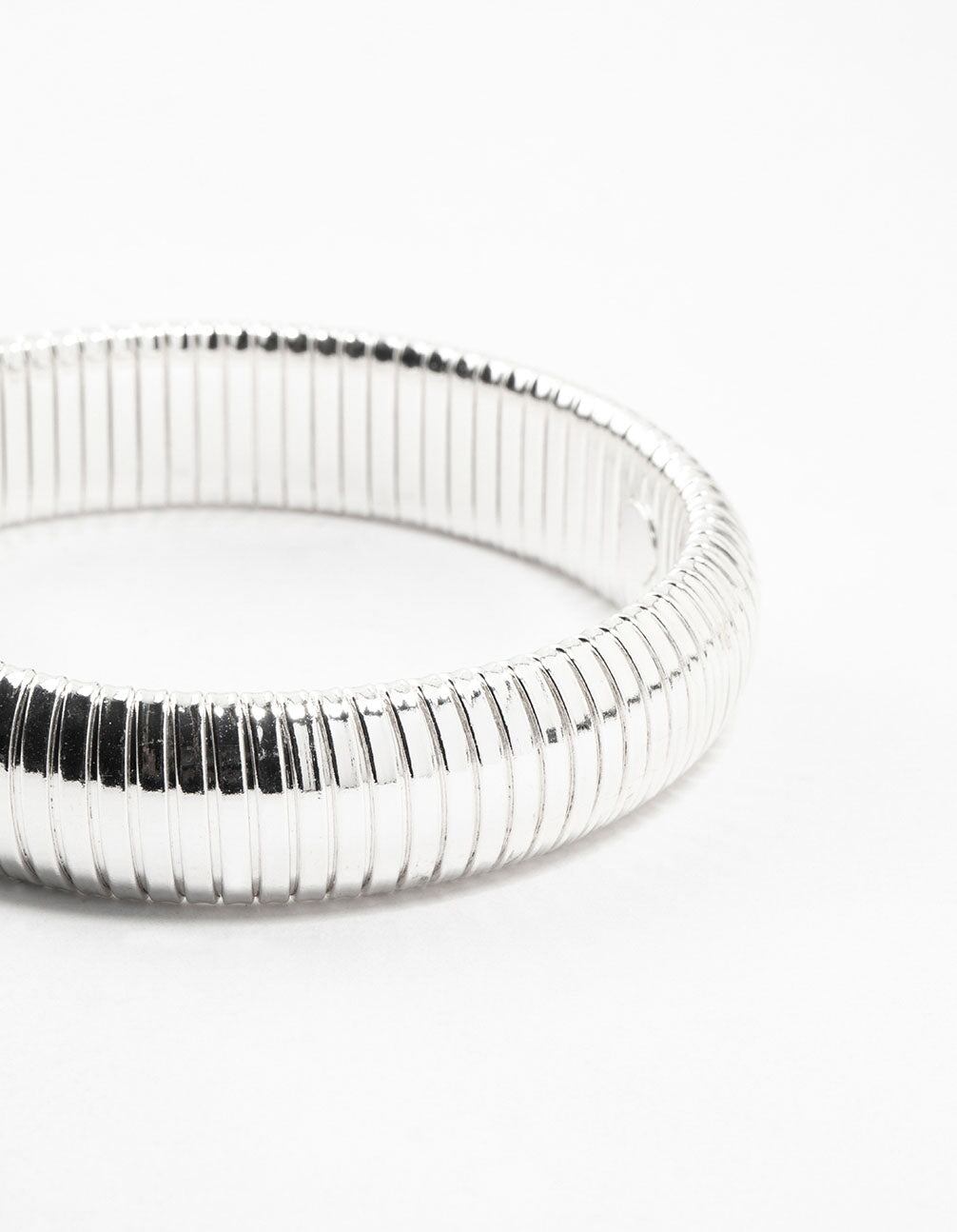 Exude effortless elegance with this Silver Plated Wide Ribbed Bracelet. This silver plated bangle features a distinctive ribbed texture. lending a modern. geometric flair to any outfit. Slip it on for an instant dose of sophisticated shine and fun texture.
