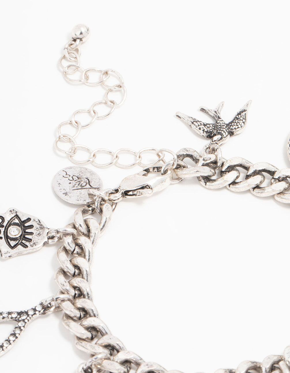 Add good fortune and luck to your look with this stunning charm bracelet! Crafted in antique silver. it features charms like horseshoes. Hamsa Hands. turquoise. and oceanic designs for a vintage. lucky vibe.